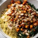 - Assemble the salad: Add the roasted chickpeas and honeynut squash to the bowl of massaged kale. Add the cooked quinoa, toasted pepitas, and golden raisins or chopped Medjool dates if using. Drizzle about half of the maple tahini dressing over the salad and toss gently to combine everything evenly. Reserve the rest of the dressing to serve alongside in individual bowls.