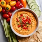 Keywords: roasted red pepper hummus, hummus recipe, vegan dip, Mediterranean dip, healthy appetizer