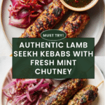 Seekh Kebab with Mint Chutney is a flavorful Indian-inspired dish featuring spiced ground lamb grilled to perfection. The smoky kebabs pair beautifully with the fresh, tangy mint chutney, making it a perfect appetizer or main course for gatherings or weeknight dinners.