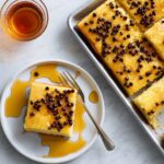 Two square pieces of light yellow cake with a soft and fluffy texture are placed on a white plate. They are topped with small dark brown chocolate chips scattered evenly across the surface and drizzled generously with thick golden syrup that pools slightly around the cake. A silver fork rests next to the cake on the plate. To the right, there is a metal baking tray with more pieces of the same cake lined up, showing the light golden crust on the bottom and the soft yellow top with chocolate chips. Above the plate, there is a clear glass cup filled with amber syrup with a small drip spilled next to it. The surface beneath everything is a white marbled texture. photo taken with an iphone --ar 4:5 --v 7