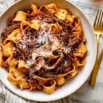 - Serve: Ladle the short rib ragu and pasta into shallow bowls. Garnish with freshly shredded parmesan cheese. For an elevated presentation, top each serving with fresh burrata, a sprinkle of flake sea salt, and chopped fresh basil.