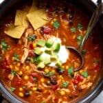 A hearty and flavorful Slow Cooker Mexican Chicken Soup packed with tender shredded chicken, black beans, corn, and a blend of aromatic spices. Perfect for a comforting and easy-to-make meal, garnished with fresh toppings like avocado, lime, and cheese for an authentic Mexican taste.