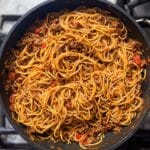 - Combine Pasta and Sauce: Add the drained spaghetti to the pot of sauce along with a splash of reserved pasta water. Stir everything together to coat the pasta well. Allow it to cook together for 5 minutes to let the sauce absorb into the noodles.