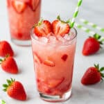 A tall clear glass filled with a light pink drink that has pieces of red strawberry mixed inside, topped with crushed ice and garnished with two visible strawberry slices on top; a green and white striped paper straw is placed in the glass on the right side. In the background, there is a slightly blurred tall glass filled with the same drink, and fresh whole strawberries are scattered around the setup on a white marbled surface. The scene looks fresh and bright photo taken with an iphone --ar 4:5 --v 7