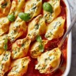 - Step 4: Spread marinara sauce in the bottom of a 13″ x 9″ baking dish. Stuff each shell with about 2 tablespoons of the ricotta mixture and arrange in the dish. Top with the remaining 1 cup mozzarella.