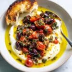 This dish is best enjoyed fresh. Store any leftovers in an airtight container in the refrigerator for up to 1 day. To reheat, briefly warm the tomato mixture in a pan and serve with fresh burrata and bread, as reheating the cheese is not recommended.