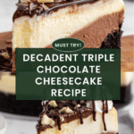 Keywords: triple chocolate cheesecake, chocolate cheesecake, layered cheesecake, no crack cheesecake, baked cheesecake, chocolate dessert